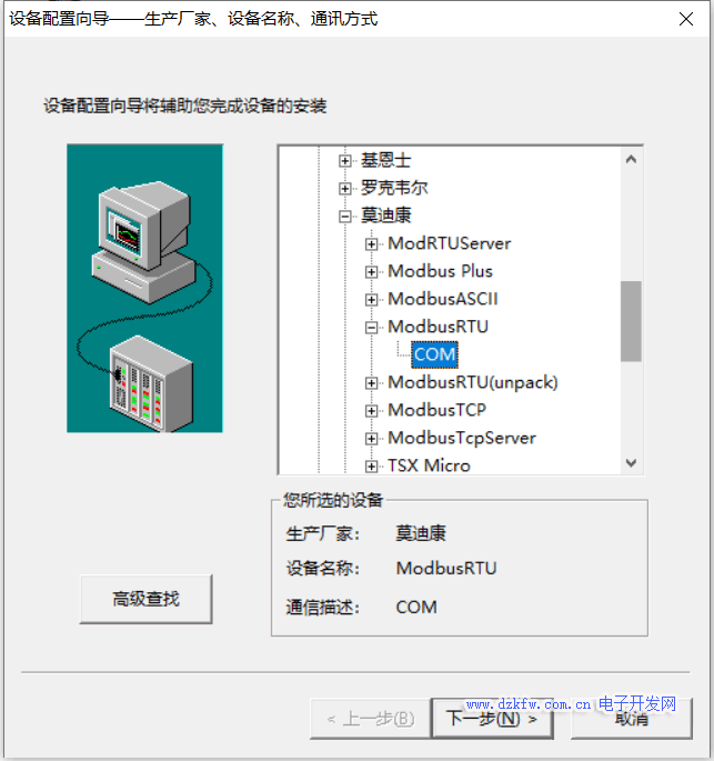 1、在组态王中,新建一个PLC–莫迪康–MODBUS RTU设备