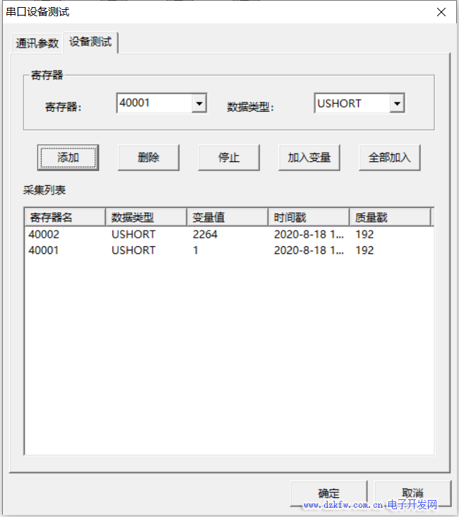 2、添加地址和数据类型,进行测试。通讯正常的话能够正常显示读取的数据。