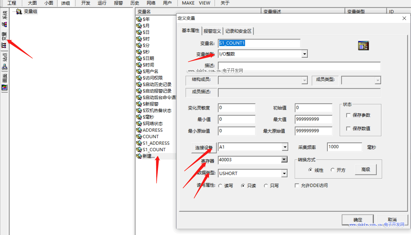 1、在变量界面,新建变量,设置变量类型、连接设备、变量地址等信息。