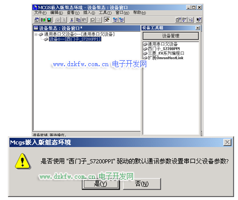 2、在设备工具箱中,鼠标按顺序先后双击“通用串口父设备”和“西门子_S7200PPI”添加至组态画面窗口,如图4-1-1所示。提示是否使用西门子默认通讯参数设置父设备,选择“是”。