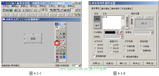 接下来双击该按钮打开“标准按钮构件属性设置”对话框,在基本属性页中将“文本”修改为Q0.0,点击确认按钮保存,如图4-1-6所示。