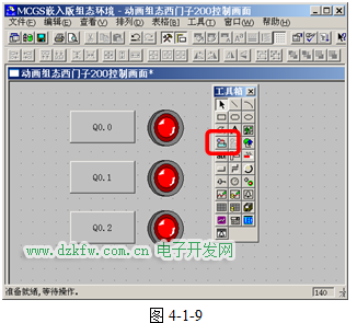 ②指示灯:单击工具箱中的“插入元件”按钮,打开“对象元件库管理”对话框,选中图形对象库指示灯中的一款,点击确认添加到窗口画面中。并调整到合适大小,同样的方法再添加两个指示灯,摆放在窗口中按钮旁边的位置,如图4-1-9。