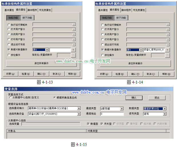①按钮:双击Q0.0按钮,弹出“标准按钮构件属性设置”对话框,如图4-1-13,在操作属性页,默认“抬起功能”按钮为按下状态,勾选“数据对象值操作”,选择“清0”,点击 弹出“变量选择”对话框,选择“根据采集信息生成”,通道类型选择“Q寄存器”,通道地址为“0”,数据类型选择“通道第00位”,读写类型选择“读写”。如图4-1-15,设置完成后点击确认。