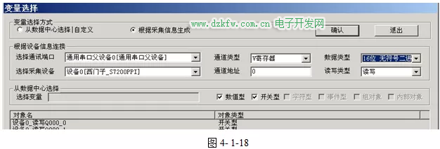 ②指示灯:双击Q0.0旁边的指示灯构件,弹出“单元属性设置”对话框,在数据对象页,点击 选择数据对象“设备0_读写Q000_0”,如图4-1-17。