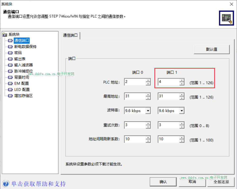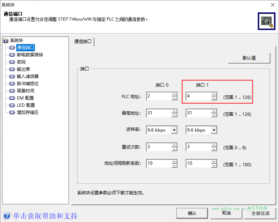 由于CPU 224XP CN这款PLC具有支持两个9针串口,具体使用哪个端口自主定义,这里我定义为端口1,PLC串口站地址设置为4,默认为2,波特率为9.6kbps也就是9600默认既可。