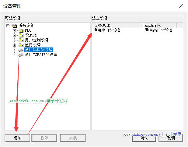 第三步:(把通用串口父设备添加至右侧选定设备)