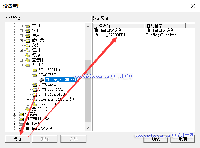 第四步:(把西门子_S7200PPI驱动添加至右侧选定设备通用串口父设备之下)