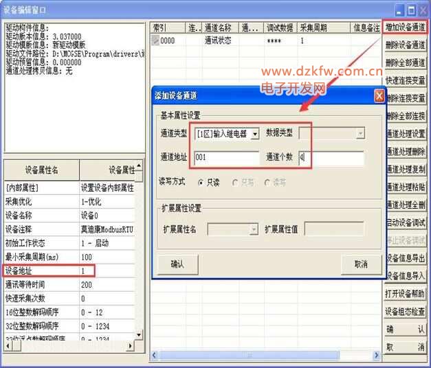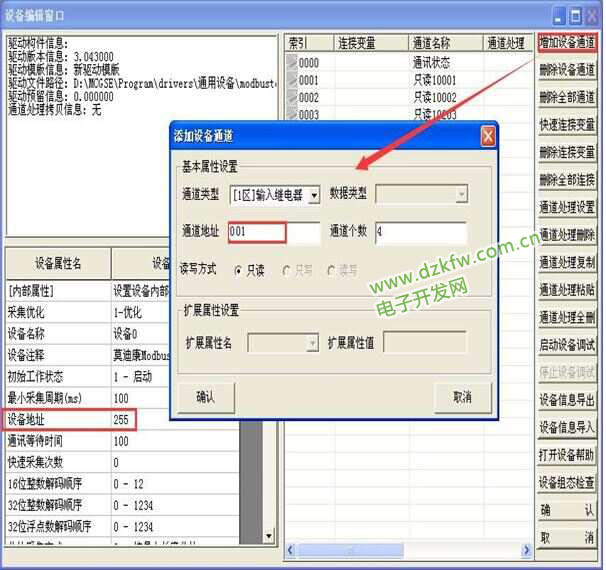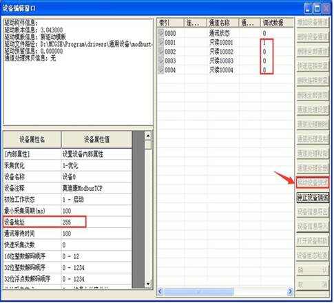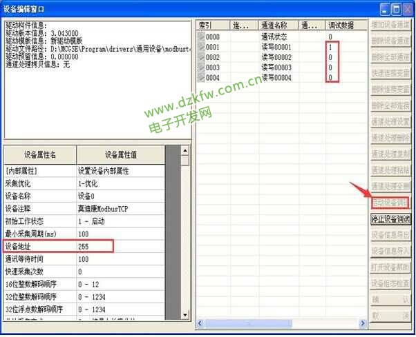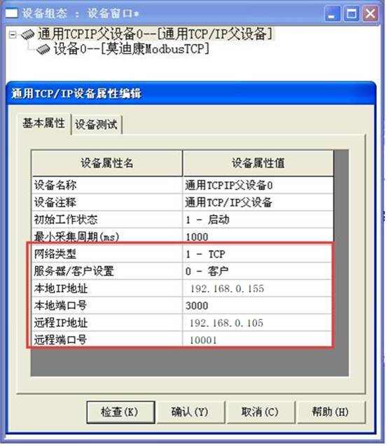 注意:MCGS工作在TCP客户端模式,其地址为192.168.0.155,ZK模块工作在服务器模式,其IP为192.168.0.105,侦听端口为10001,这里我们没用modbus的默认502端口,请客户在使用时注意。