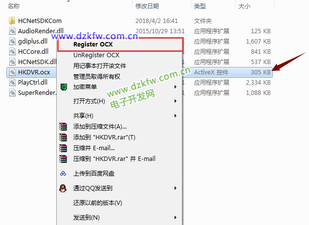 打开控件文件,找到HKDVR.OCX,右击选择Register OCX即可完成控件注册,如下图所示: