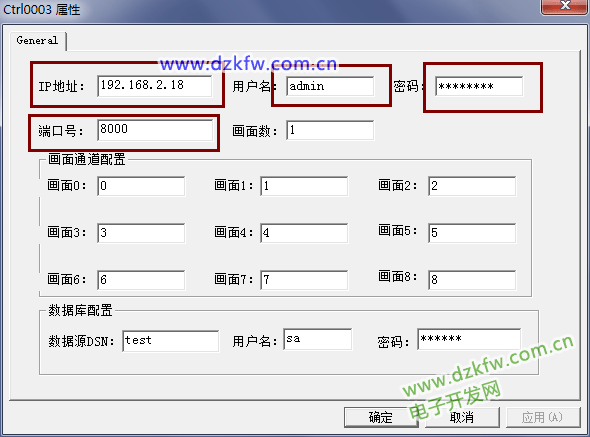 按住鼠标左键绘制控件大小区域,右击选择控件属性,弹出控件属性对话框,设置好IP、用户名、密码、端口号即可,如下图所示: