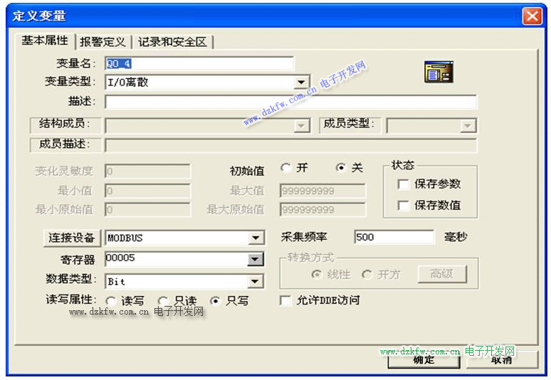 定义变量名,变量类型为I/O离散,连接设备选择MODBUS,选择相应的寄存器,数据类型为Bit,并定义读写属性。I0.0-I0.3输入寄存器变量和Q0.0-Q0.3输出线圈变量