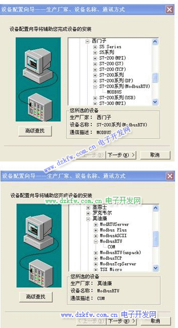 双击工程管理器中新建的工程,进入工程浏览器界面,选择工程浏览器中的 设备→COM1→新建…进入设备配置向导,选择PLC→莫迪康→ModbusRTU→COM