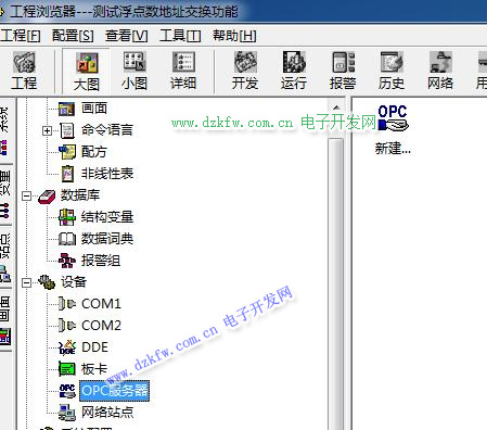 在组态王工程浏览器的“设备”项目中选中“OPC服务器”,工程浏览器的右侧内容区显示当前工程中定义的OPC设备和“新建OPC”图标。