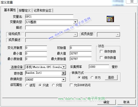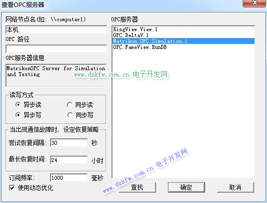 “网络节点名”编辑框中为要查看OPC服务器的计算机名称,默认为“本机”。如果需要查看网络上的其它站点的OPC服务器,在编辑框中输入节点的UNC路径。如计算机名称为“数据采集站”,则输入“数据采集站”,然后单击“查找”按钮,如果查找成功,则在右边的“OPC服务器”列表中显示目标站点的所有已安装的OPC服务器名称;如果没有查找到,则提示查找失败。“OPC服务器信息”文本框中显示“OPC服务器”列表中选中的OPC服务器的相关说明信息。如选中“KingView.View.1”,则在信息中显示“KingView.View”。 “读写方式”是用来定义该OPC设备对应的OPC变量在进行读写数据时采用同步或异步方式。“尝试恢复间隔”和“最长恢复时间”用来设置当组态王与OPC服务器之间的通讯出现故障时,系统尝试恢复通讯的策略参数。“订阅频率”,目前组态王异步读是按照订阅的方式实现的,可以根据不同的需要进行设置。“使用动态优化”是组态王对通讯过程采取动态管理的办法。“尝试恢复间隔”,“最长恢复时间”,“使用动态优化”的具体含义与IO设备定义向导中的相同。用户可以在列表中选择所需的OPC服务器。单击“确定”按钮。“查看OPC服务器”对话框自动关闭,OPC设备建立成功。如选择图中的“MatriKon.OPC.Simulation.1”,建立的OPC设备如图所示。