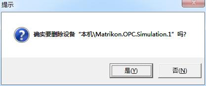 对于已经建立的OPC设备,如果您确认不再需要,可以将它删除。如图3,选中要删除的OPC设备,单击鼠标右键,在弹出的如图4所示的快捷菜单中选择删除,弹出如图5所示的提示信息,如果选择“是”,则将该设备从组态王中删除。