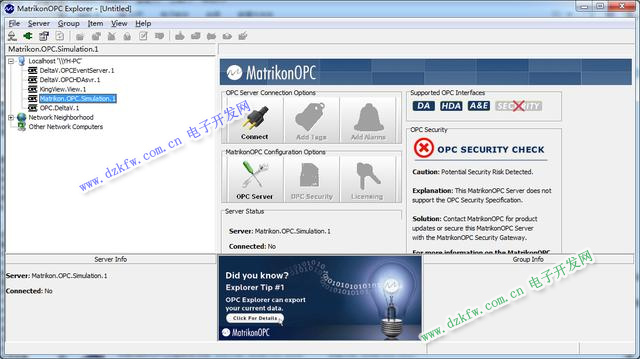 OPC服务器作为一个独立的应用程序,可能由硬件制造商、软件开发商或其他第三方提供,因此数据项定义的方法和界面都可能有所差异。下面以MatrikonOPCExplorer为例讲解OPC Server的使用方法。MatrikonOPCExplorer应用程序是比较实用的服务器,同时还可以作为客户端。安装好MatrikonOPCExplorer后,打开MatrikonOPCExplorer主窗口如图所示。