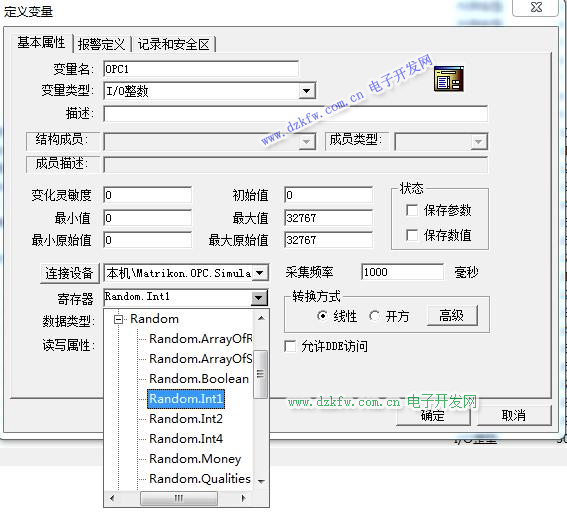 在寄存器下拉式菜单中列出了在OPC服务器中定义过的所有项目名及数据项,项目名和数据项以树型结构排列,如果某个分支下还有项目的话,鼠标双击该分支,隐藏在该分支下的数据项会自动列出来。鼠标双击选择对应的数据项,则选择的数据项会自动添加到“寄存器”中。如图9所示,选择的数据项是“Simulation Items”---“Random”---"Random.Int1"。