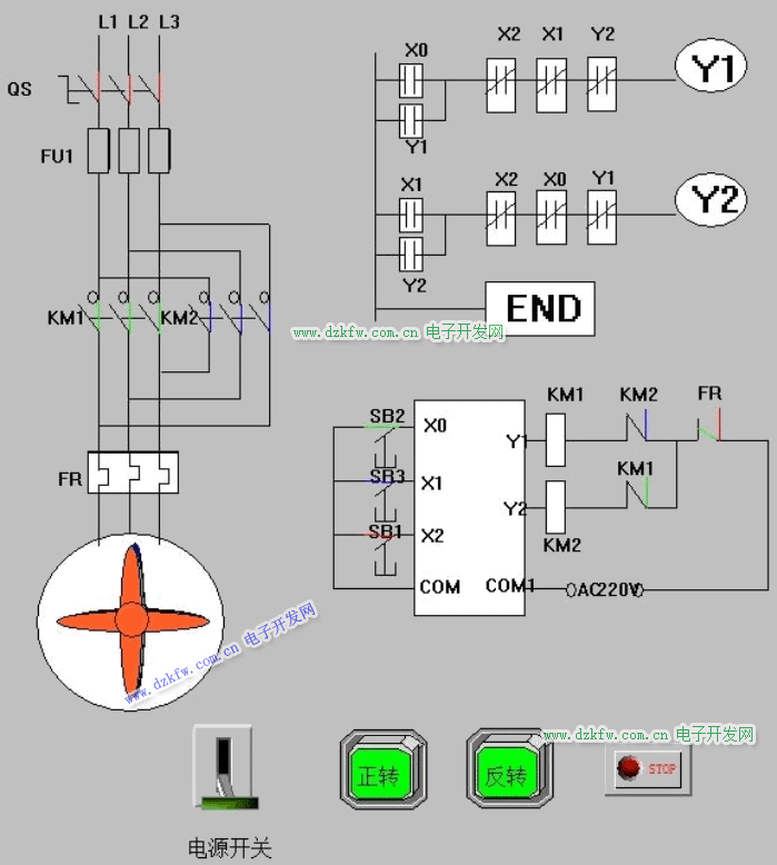 1 、画一个风扇以表示电动机的正反转运行。同时画这个电动机 正反转的控制面板。控制面板上设有总的断路器、停止、正转、 反转按钮。