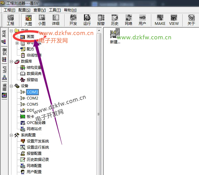 打开组态王编程软件,进入新建的组态王工程,选择工程浏览器左侧大纲项“画面”,