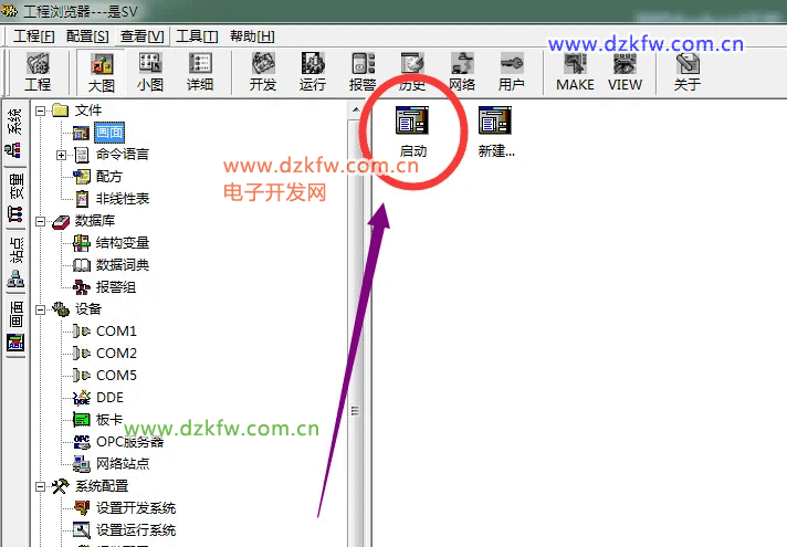 在工程浏览器右侧用鼠标左键双击“启动”图标,进入开发系统对话框。