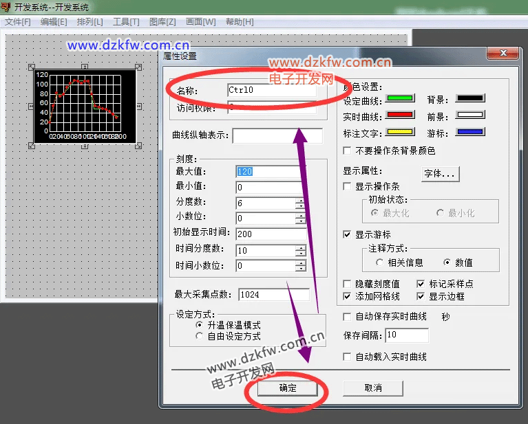 点击温度曲线图标,进入属性设置菜单输入数据类型,并点击确定,组态王温度控件就设置完成了