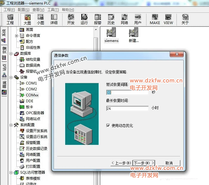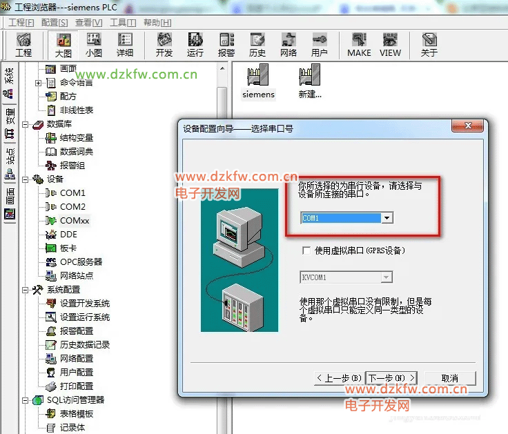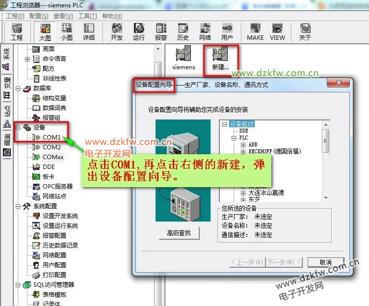 打开组态王软件,点击设备下的COM1,再点击右侧的新建,弹出设备配置向导。