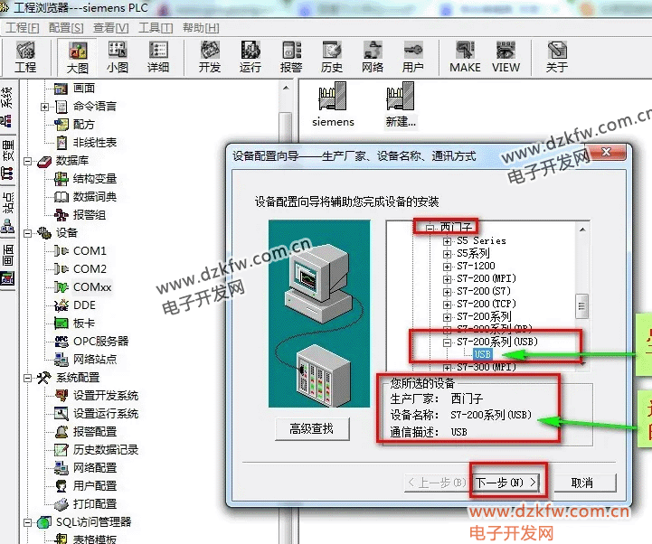 点击向导下的 PLC - 西门子 - S7-200系列(USB)下的USB选项,选中后,可查看当前的设备情况。然后点击下一步。