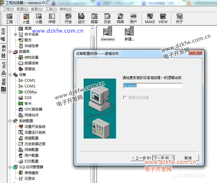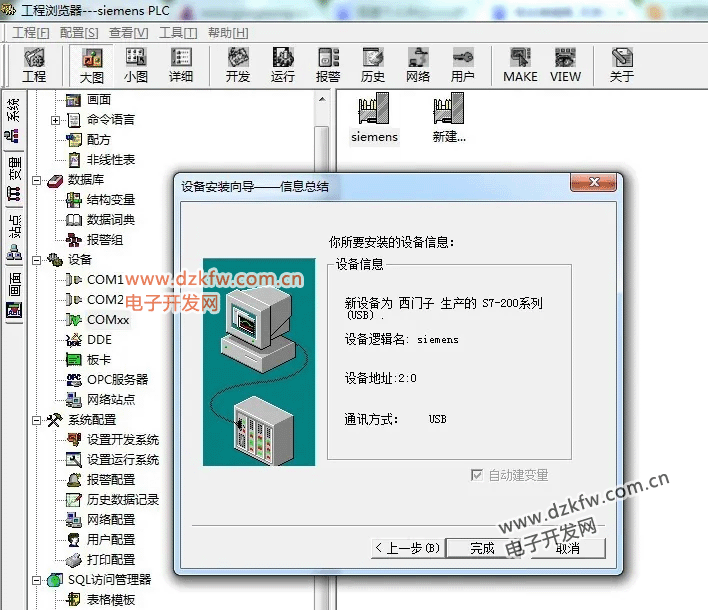 给组态的PLC指定一个名称,当前指定为: siemens。再点击下一步