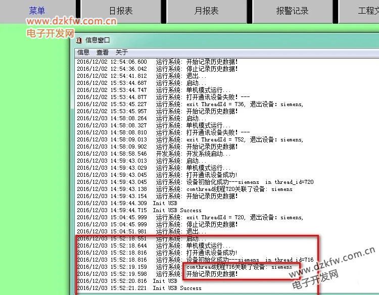 用可以通过信息窗口查看组态王与PLC有没有连接成功,如图所示以关联设备