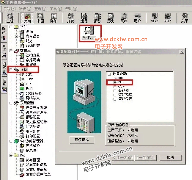 ②点击“设备—新建”打开设备配置向导页,点击展开“PLC”项(见下图2);