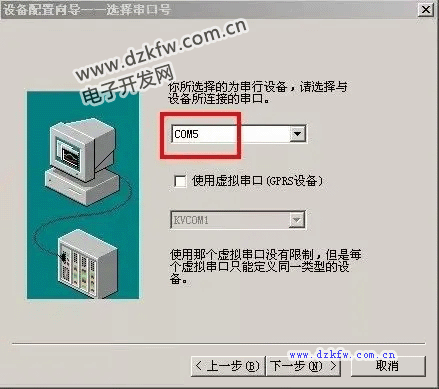 ⑤选择与FX2系列PLC连接的串口号,如COM5(见下图5),这个很关键,不能搞错。