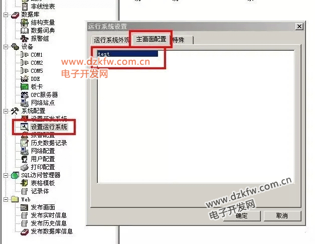 6、设置运行画面。选回到工程浏览器界面,选择“设置运行系统—主画面配置—test”,目的是指定系统运行时打开的画面(见下图16)。
