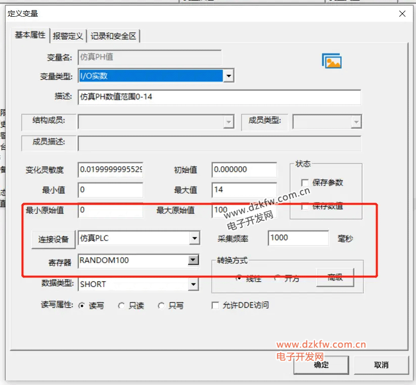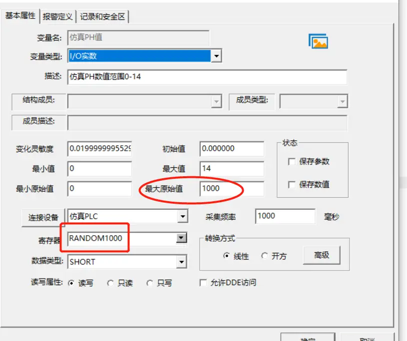变量类型:I/O实数;变化灵敏度:0.1;初始值为0.0;最小值为0,最大值为14;寄存器选择随机函数RANDOM10 (表示随机值的范围是0-10);这个是最小原始值到最大原始值。
