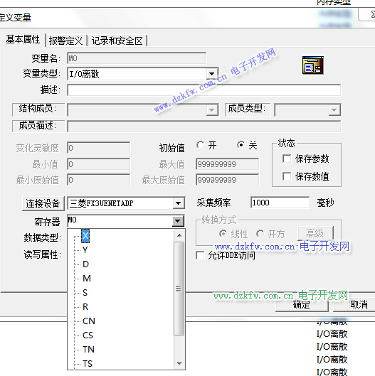 变量名随便写,变量类型为I/O离散型,连接的设备为上面第二步PLC指定的名称,寄存器为M0 点击确定。