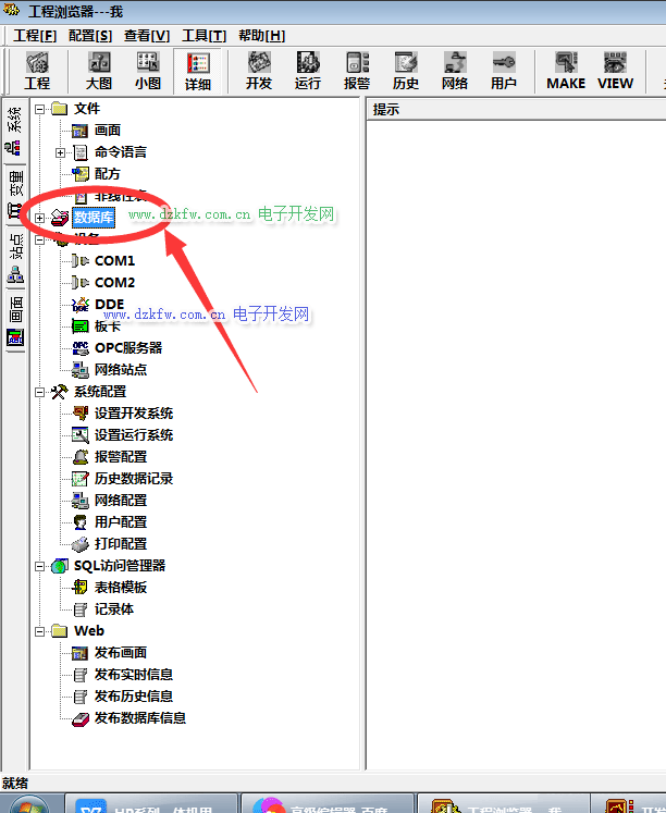 打开组态王组态软件,在项目树菜单栏中选择【数据库】并点击打开。