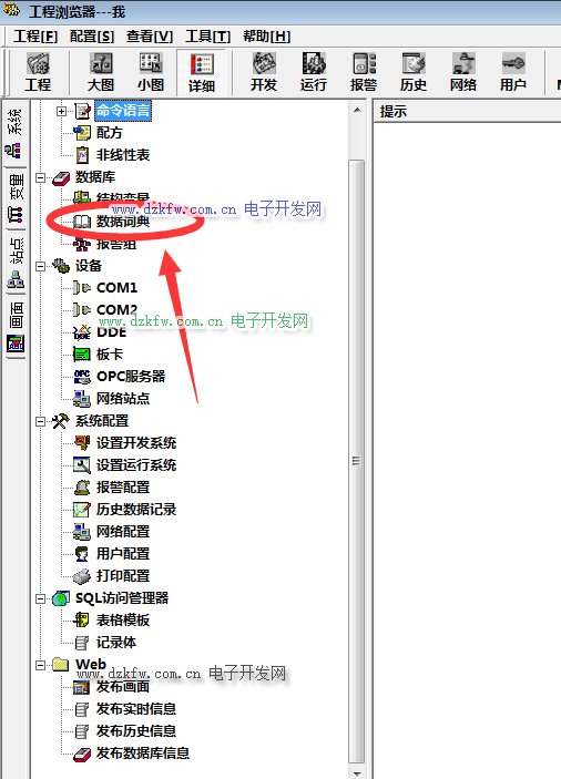 在数据库下拉菜单中选择【数据词典】并点击打开。