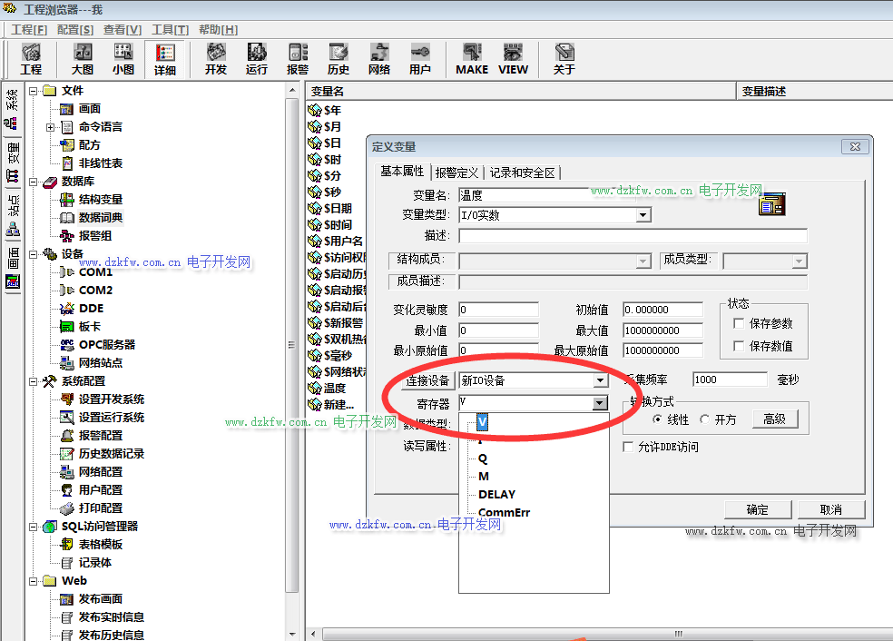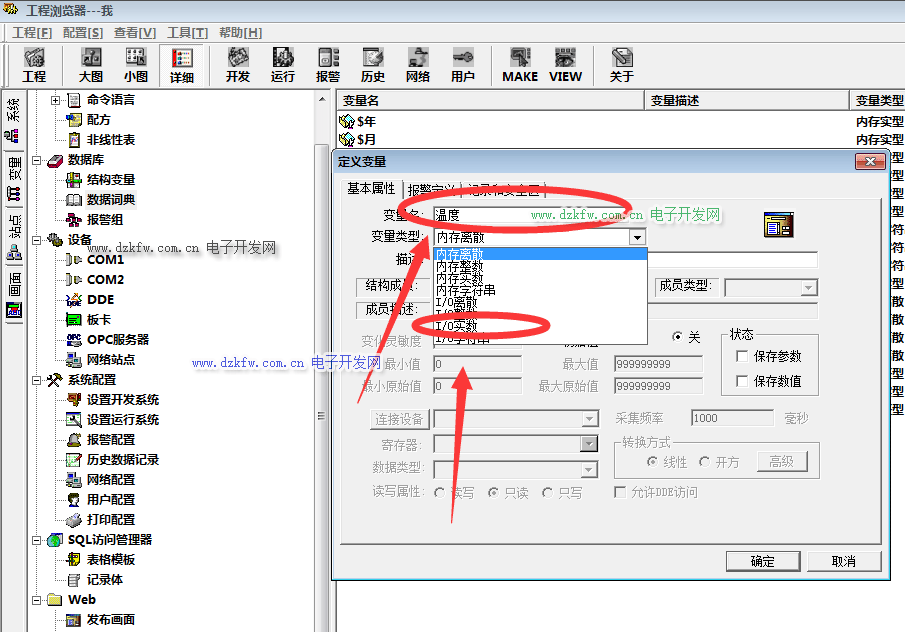 然后在弹出的定义变量窗口中,变量名输入为【温度】,变量类型选择【I/0实数】