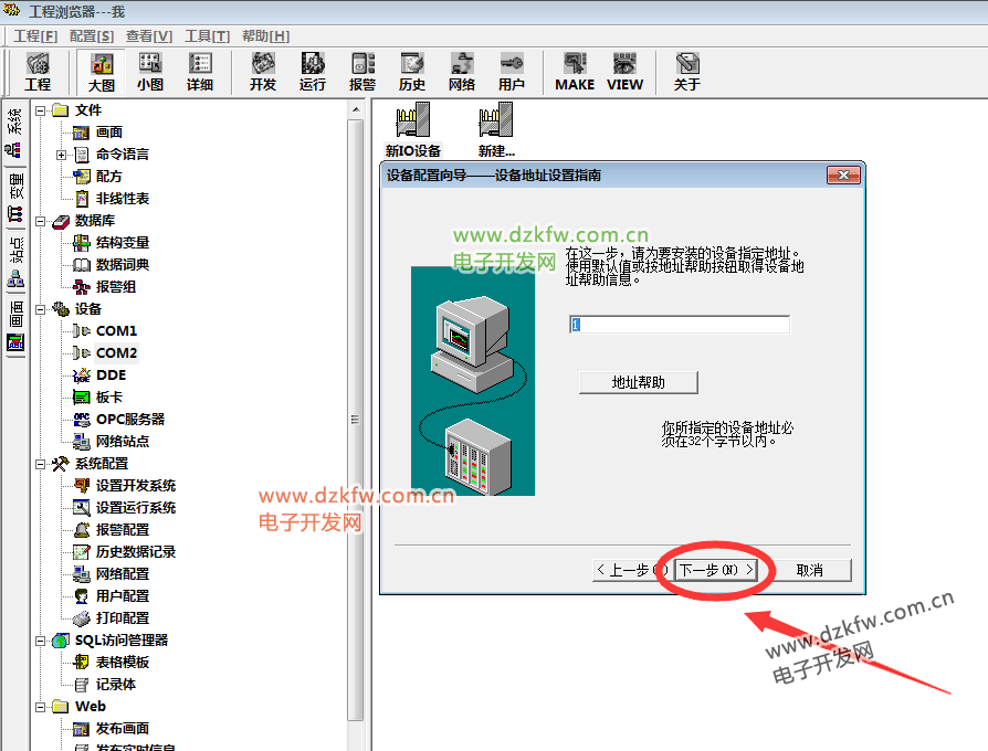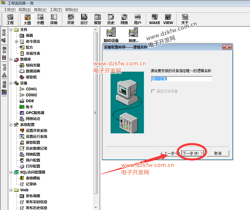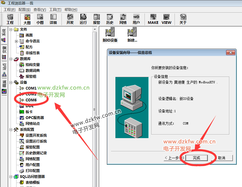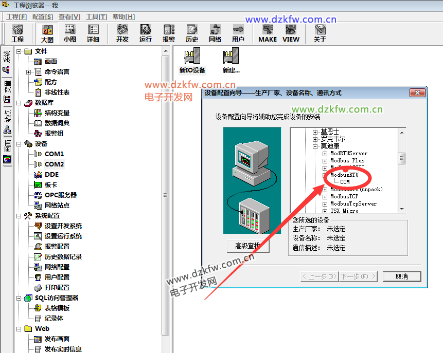 在弹出的设备配置向导中依次选择莫迪康 /modbus RTU / com}通讯