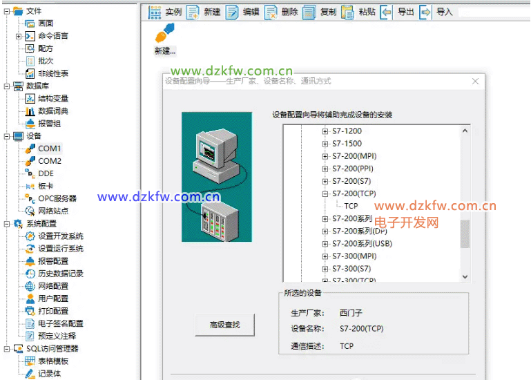 其与IO设备进行通讯一般是通过调用*.dll动态库来实现的,不同的设备、协议对应不同的动态库。工程开发人员无须关心复杂的动态库代码及设备通讯协议,只须使用组态王提供的设备定义向导,即可定义工程中使用的I/O设备,并通过变量的定义实现与I/O设备的关联,对用户来说即简单又方便。