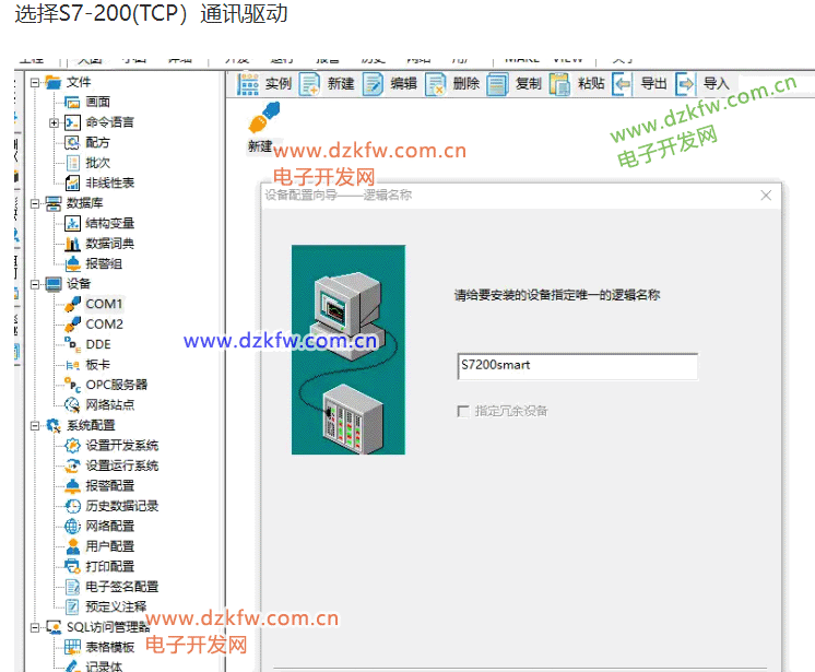 它把第一台下位机看作是外部设备,在开发过程中可以根据“设备配置向导”的提示一步步完成连接过程。在运行期间,组态王通过驱动程序和这些外部设备交换数据,包括采集数据和发送数据/指令。