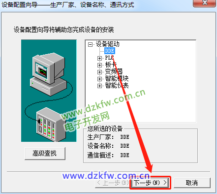 第八步:(点击右侧新建,打开设备配置向导,选择DDE驱动,点击下一步。)