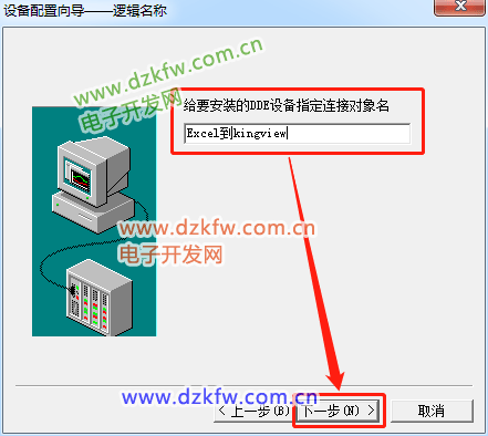 第九步:(连接对象名,输入:Excel到kingview)。