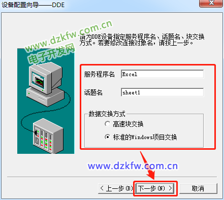 第十步:(服务程序名为新建的需要通讯Excel表格名称,话题名为此Excel中的电子表格sheet1、sheet2等选择其中一个。数据交互方式选择:标准的Windows项目交换,然后点击下一步。)