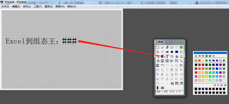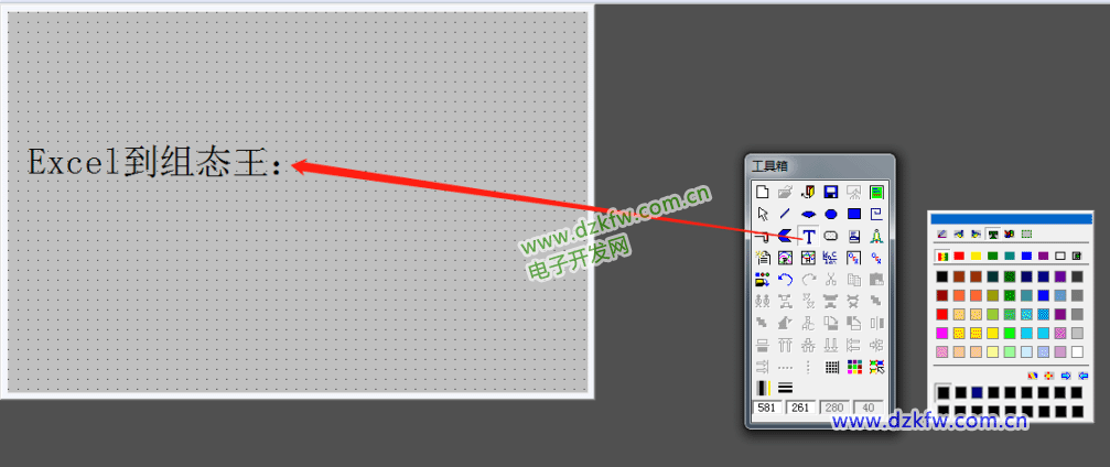 第十七步:(现在开始建立画面,先在左边工具箱选择大写蓝色的T点击选中,然后点击到左边画面开始输入文字:Excel到组态王:)。