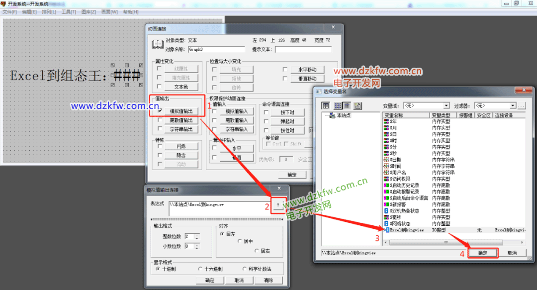 第十九步:(双击三个#号打开数显属性设置对话框,1.值输入选择勾选模拟量输出 2.打开模拟量输出对话框,表达式点击正方向问号。3.打开变量名对话框,选择第十四步创建的变量,点击确定。)