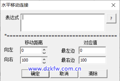 这几个选项的意思是:表达式对应值为“最左边”(0)时,那么该方块在当前位置向左移动0;表达式对应值为“最右边”(100)时,该方块在当前位置向右移动100个像素;如果表达式的值介于两者直接,则用线性比例确定(类似于map函数);如果表达式的值小于0或大于100,方块仍处于最左边和最右边,相当于限位。