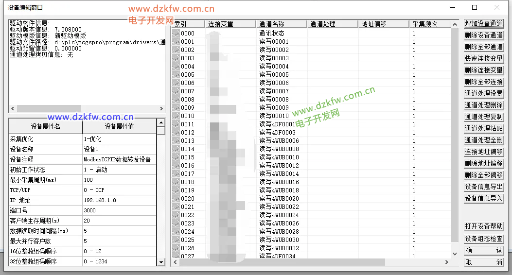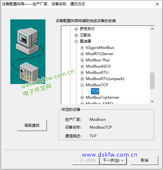在设备驱动,选择PLC→莫迪康→ModbusTCP→TCP。