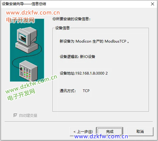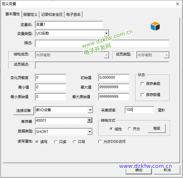 输入变量名,选择变量类型,选择链接设备,选择寄存器,输入寄存器地址,选择数据类型。