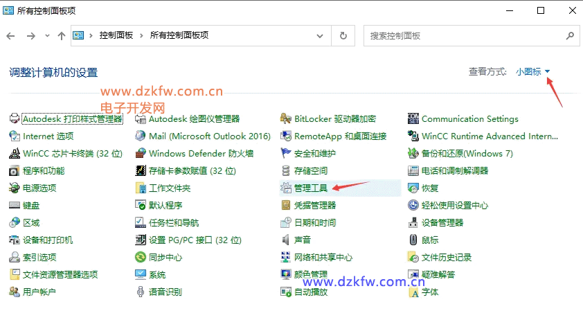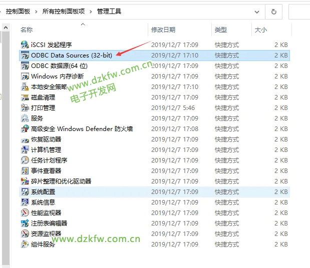 我使用的数据库是微软自带的Microsoft Access 数据库,使用前先创建好数据表,打开电脑的控制面板,把查看方式改为小图标,然后选择管理工具,再选择 ODBC 数据源32位。
