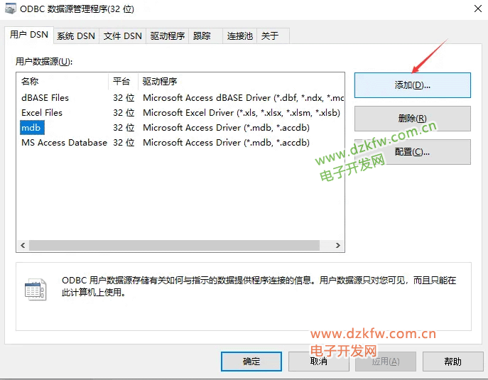 双击打开,点击添加,选择驱动程序,起个名称,选择你新建的数据库。